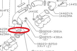 Packningen mellan röret från turbosarna som det står ”Twin Turbo” på och anslutningen till främre turbon. Samma packning sitter på utgången från kompressorhuset. Totalt 3st / motor (RB26)